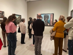La artista Ana Nance guió a los Amigos del MNAD por la muestra que recoge las fotografías que documentan la aventura personal que emprendió en 1992: un viaje de 100 días en el que visitó 20 ciudades de todo el mundo, sin ayuda de aviones, teléfonos móviles ni Internet, llevando únicamente dos cámaras analógicas Leica M4 y M6 y su propia curiosidad instintiva.